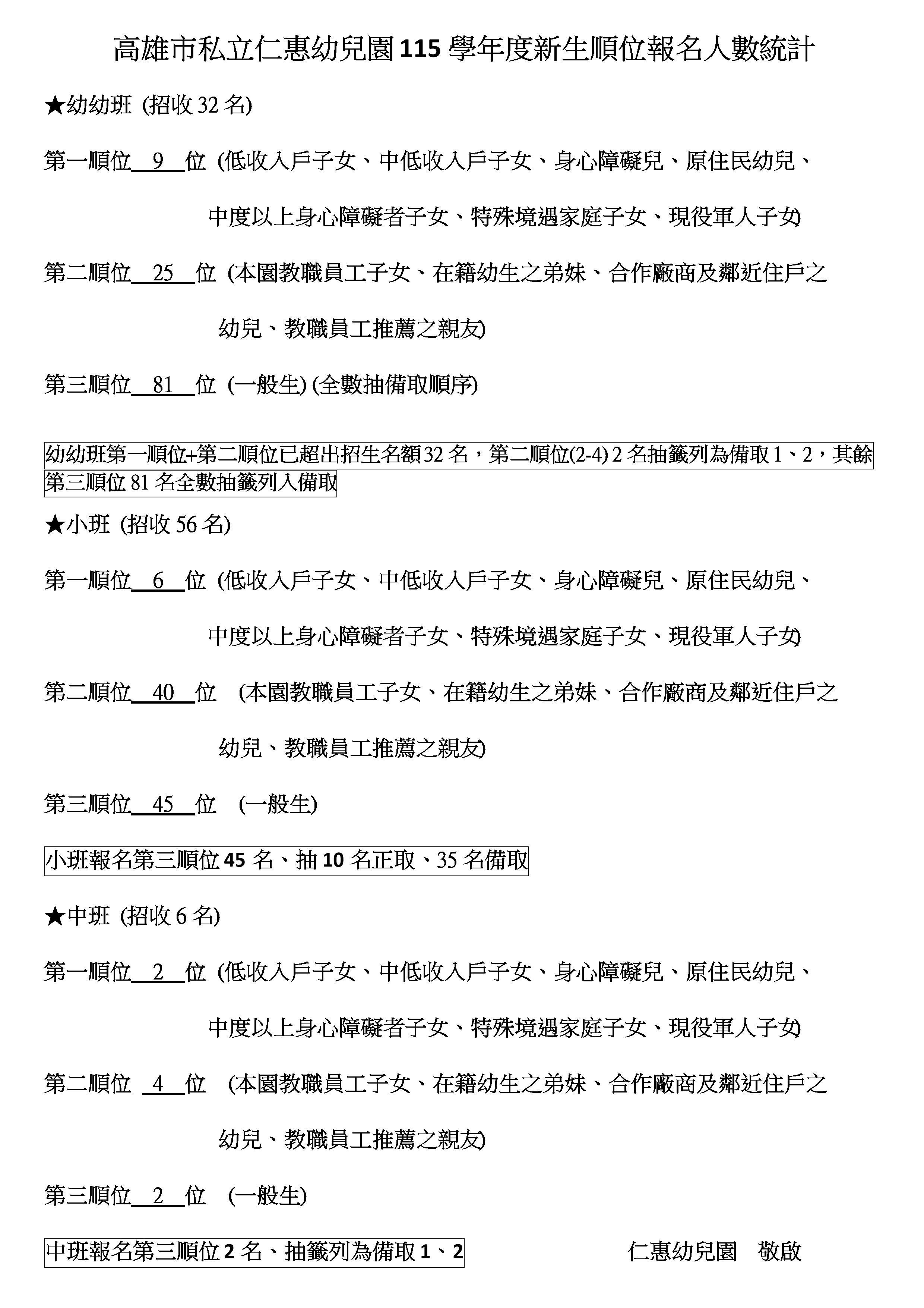 仁惠幼兒園115學年度新生順位報名人數統計表