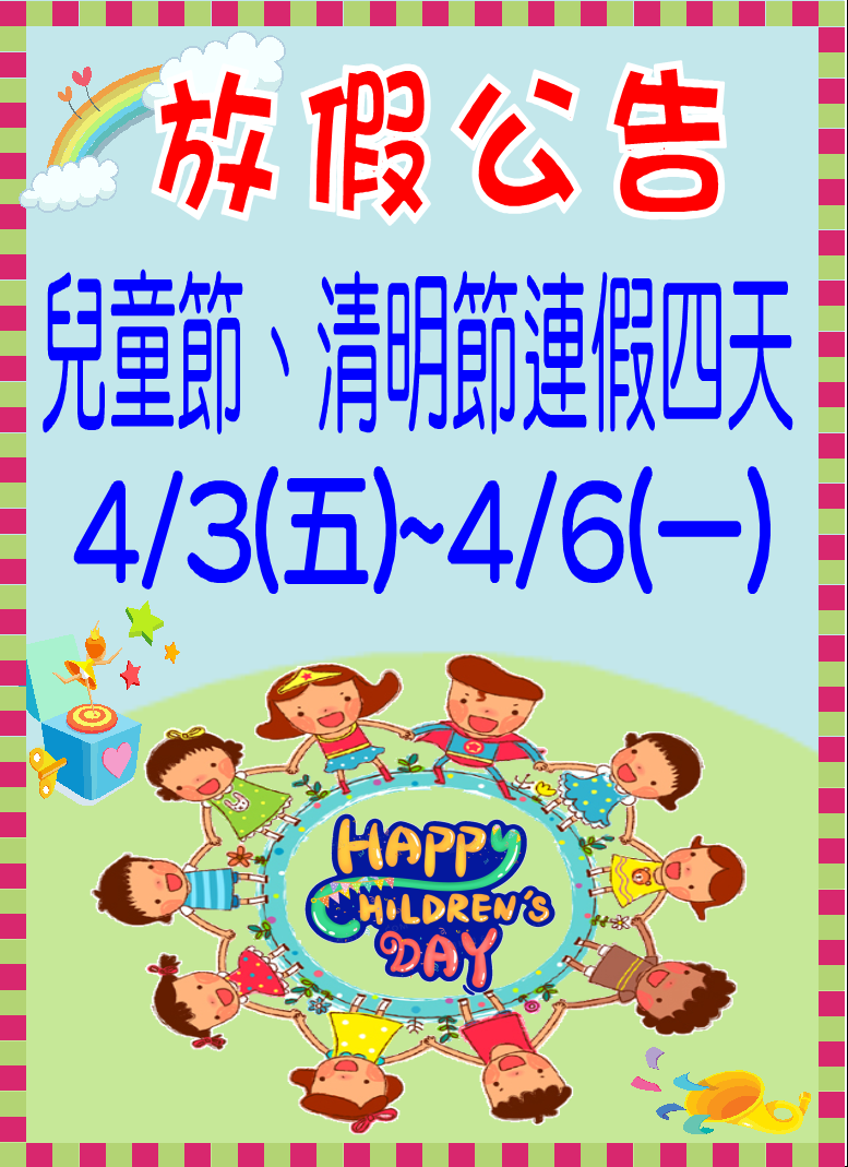 4/3(五)~4/6(一)兒童節.清明節連假四天-放假通知